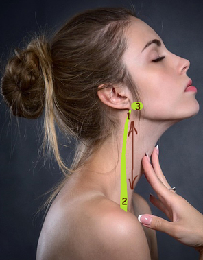 Procedere lentamente e delicatamante dal punto 1 al punto 2, e poi viceversa per 10 volte, sia sul lato destro che su quello sinistro.